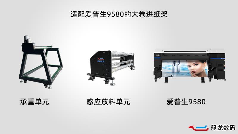 除了Epson 9580打印机,市面上只要是上卷材的数码彩印机都能使用,不限定品牌,类似国产机、爱普生原装机等,甚至其他非数码打印领域,需求符合,也可以使用这款卷放料架。