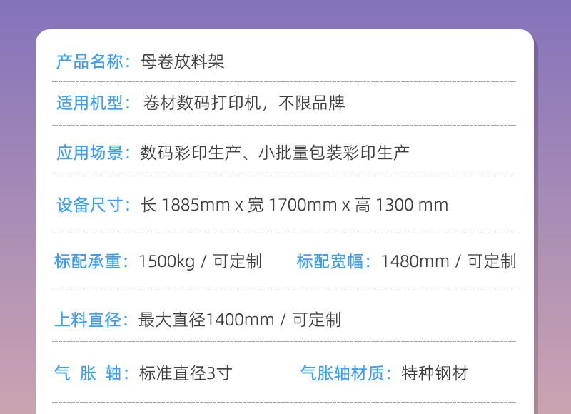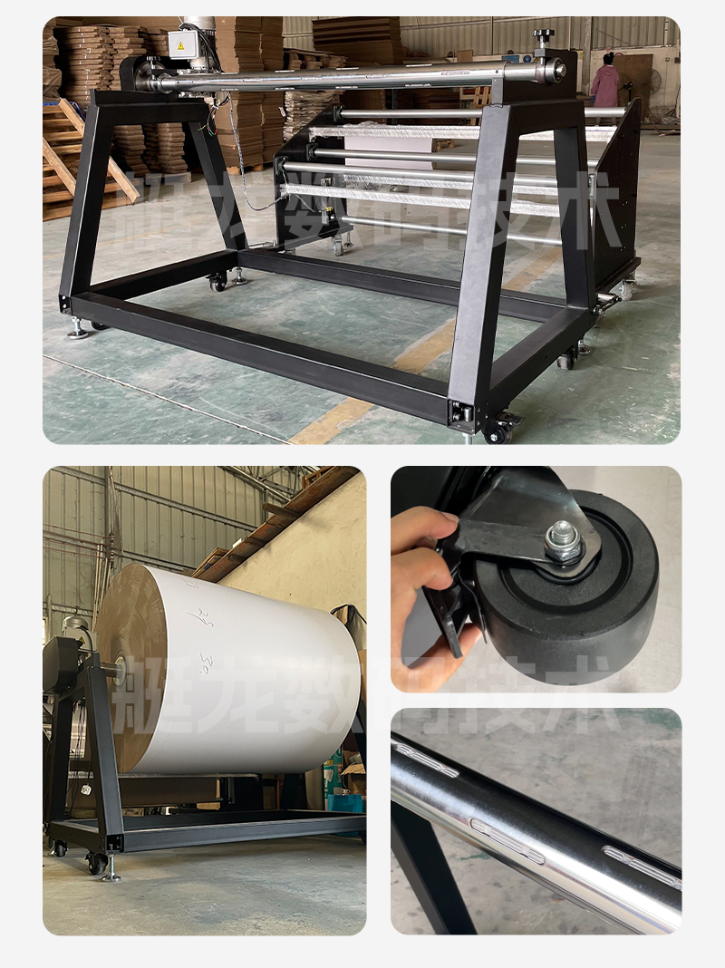 只要是上卷材的数码彩印机都能使用,不限定品牌,即不仅可用于我司的彩印机,市面上的卷对卷数码打印机均能使用该母卷放料架。