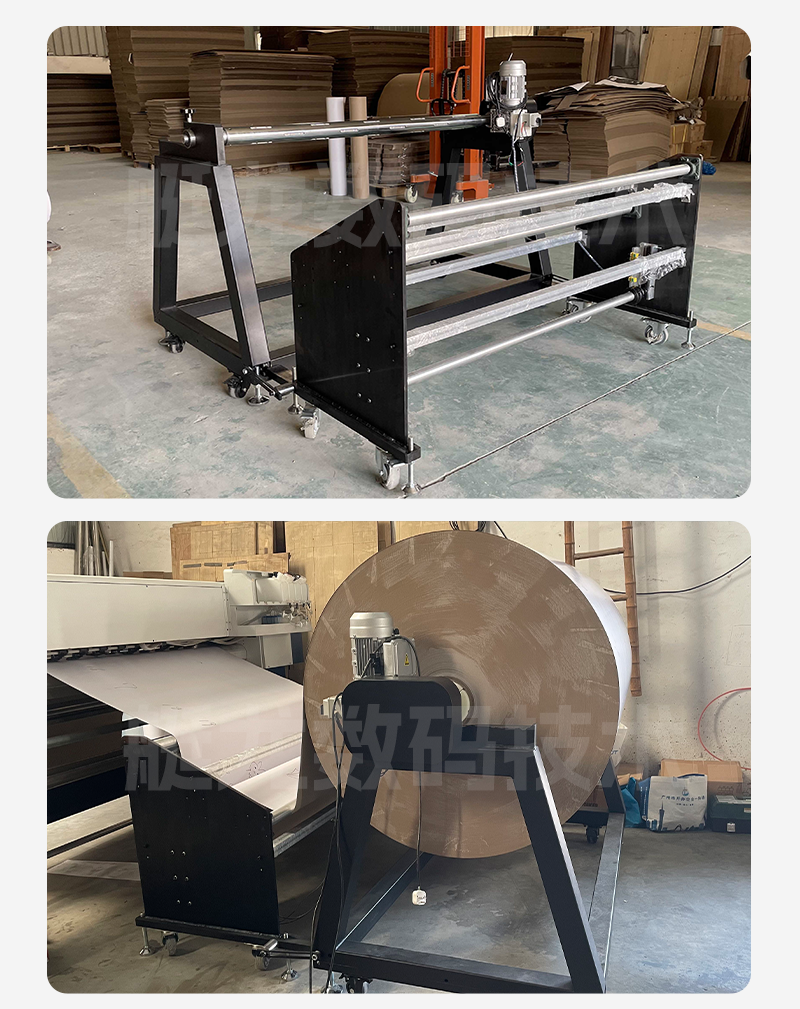 在小批量彩盒彩箱数码打印生产中,当打印的纸张品种不多,需要长时打印,为了避免频繁换纸上料,可以选配我们这款独立的母卷放料架。该母卷送纸系统采用分体设计,只需简单的组装调试即可工作。最大可以承重两吨母卷原纸,与数码打印机器同步联动工作,具有牢固可靠、走纸平顺精确的优点,已在我司众多客户中稳定应用。